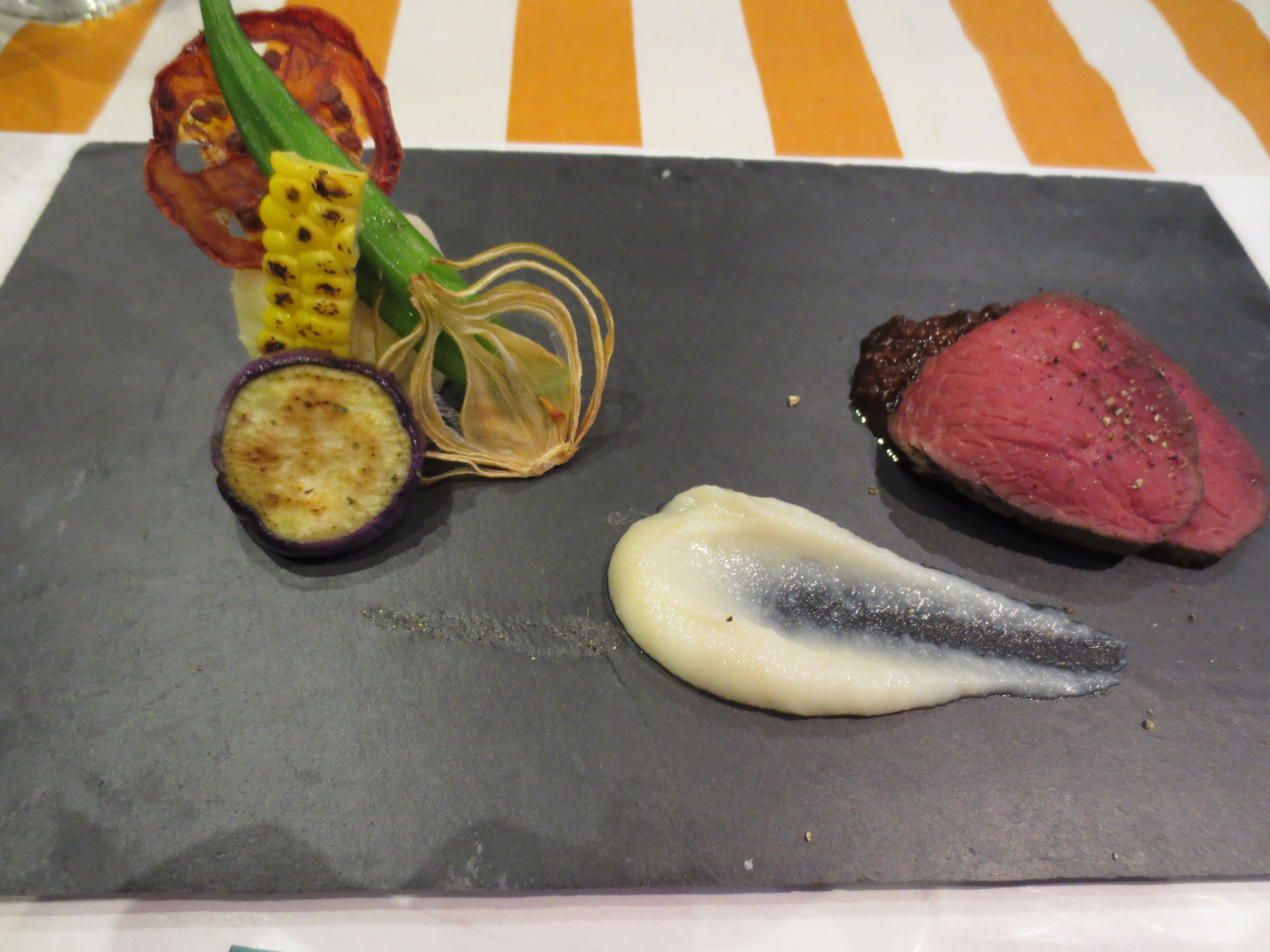 料理はどれも素材の味を生かしたもので、とてもおいしくいただきました。また、前菜とメインディッシュは雄勝石で作られた皿で提供されました。テーブルは「石巻工房」で制作されたテーブルだったとのことです。また、メニューや地域の生産者の方の紹介など、随所にこだわりの見られた会となりました。