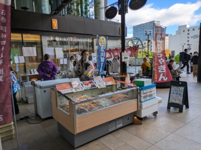 11月12日(水)、13日(木)の2日間に渡り、JR仙台駅東西自由通路を会場に、石巻市6次産業化・地産地消推進センター主催により対面販売会が開催されました。石巻市内の8事業者が出店し、牡蠣、ほや、くじら、わかめ・昆布、ちゃきん、ずんだ餅、石巻素材焼き菓子、ベビーカステラなど、石巻自慢のおいしい逸品を販売しました。多くのお客様にご来場いただき誠にありがとうございました。
