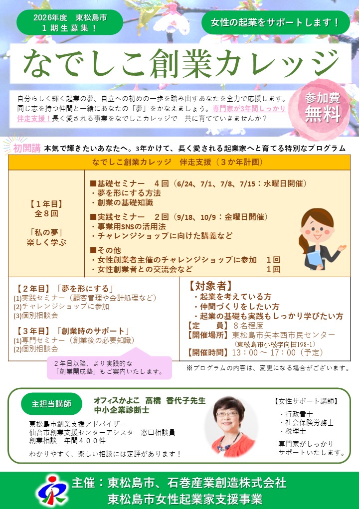 2026年度 東松島市 「なでしこ創業カレッジ」開催